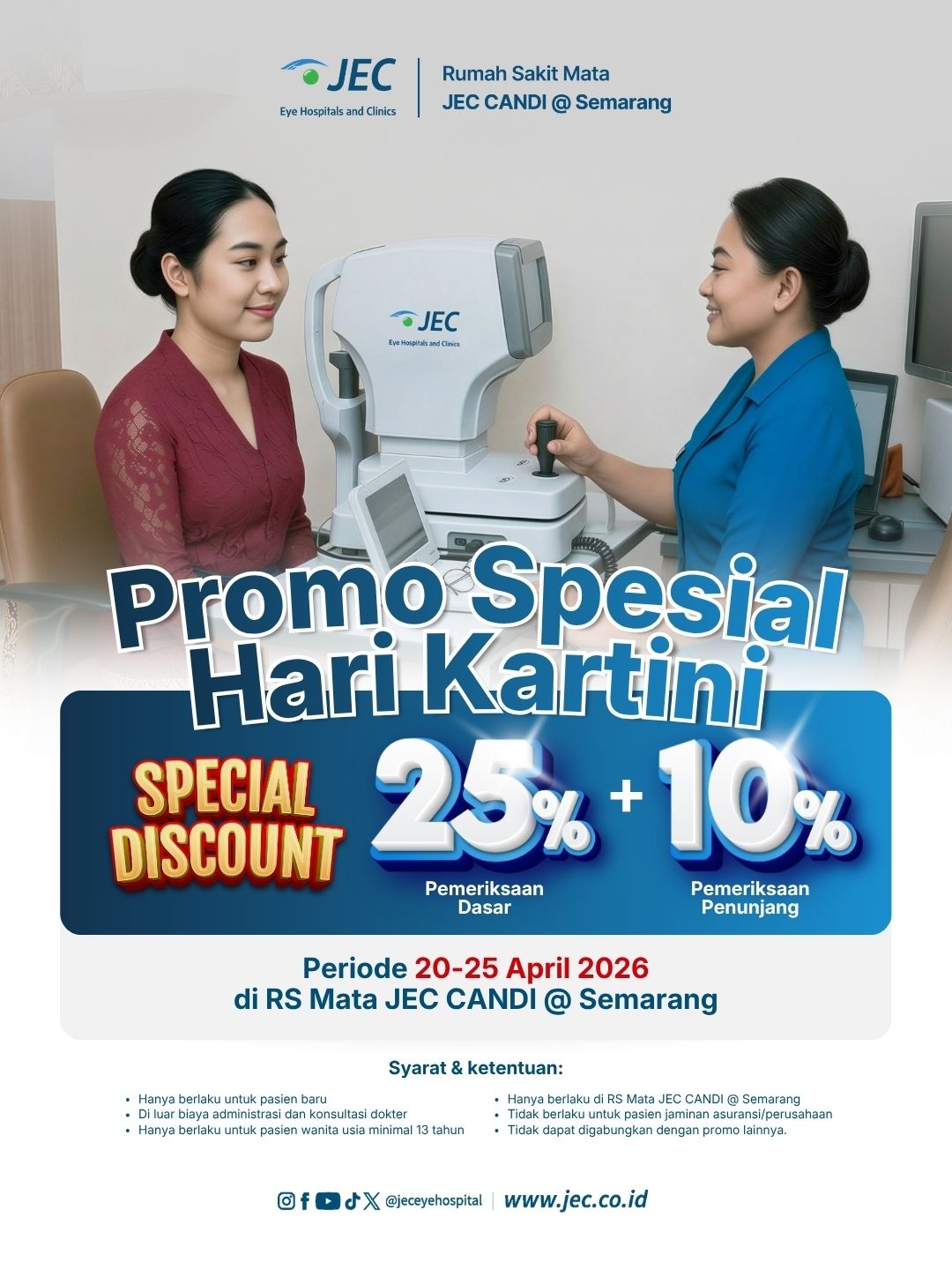 Dalam rangka memperingati Hari Kartini, RS Mata JEC CANDI @ Semarang menghadirkan promo spesial bagi pasien wanita berupa diskon 25% untuk pemeriksaan dasar dan tambahan diskon 10% untuk pemeriksaan penunjang. Promo berlaku pada 20–25 April 2026 khusus untuk pasien baru wanita usia minimal 13 tahun.