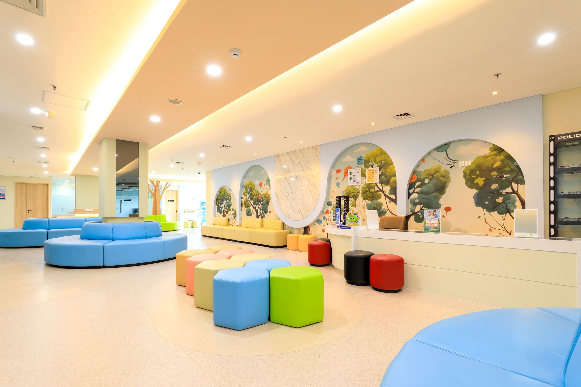 - A waiting room designed for children to play and do activities like reading or watching children's movies.