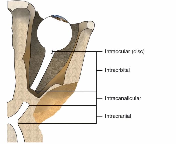 Saraf mata memiliki struktur kompleks yang tersusun dari jutaan serabut saraf yang terbagi menjadi beberapa bagian berdasarkan lokasinya. Secara anatomi, saraf mata dibagi menjadi empat bagian utama berikut: